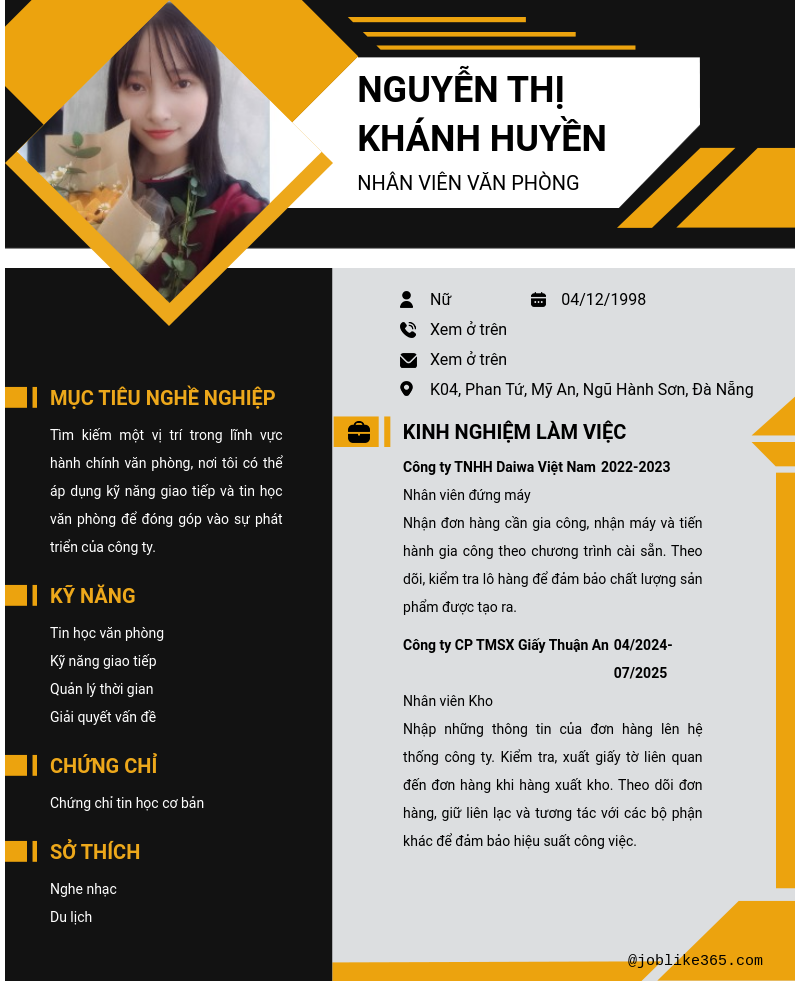 Xem hồ sơ ứng viên NGUYỄN THỊ KHÁNH HUYỀN cần 2 điểm. Hồ sơ được cập nhật ngày: 21/10/2025
