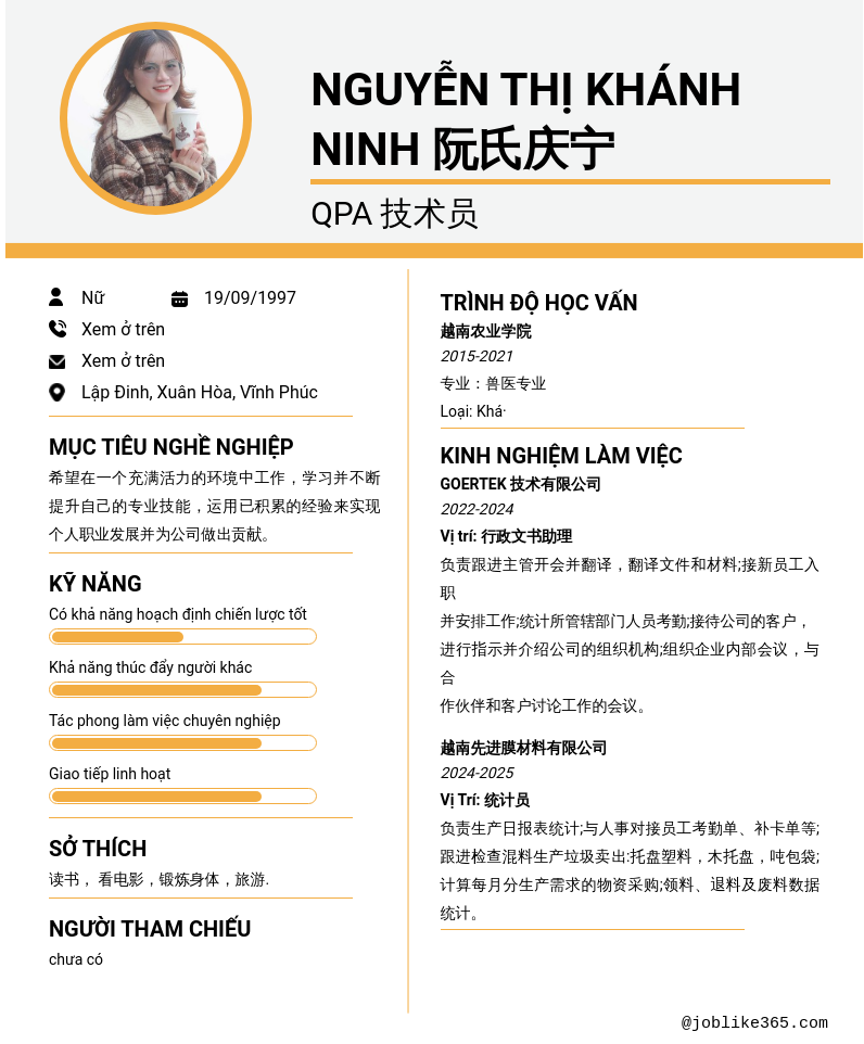 Xem hồ sơ ứng viên Nguyễn Thị Khánh Ninh 阮氏庆宁 cần 2 điểm. Hồ sơ được cập nhật ngày: 13/10/2025