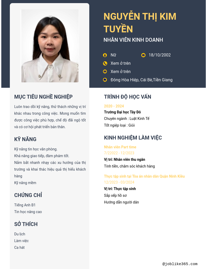 Xem hồ sơ ứng viên Nguyễn Thị kim tuyền cần 2 điểm. Hồ sơ được cập nhật ngày: 09/09/2024