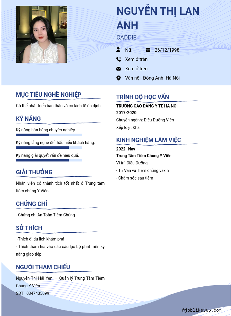 Xem hồ sơ ứng viên Nguyễn Thị Lan Anh cần 2 điểm. Hồ sơ được cập nhật ngày: 23/09/2024