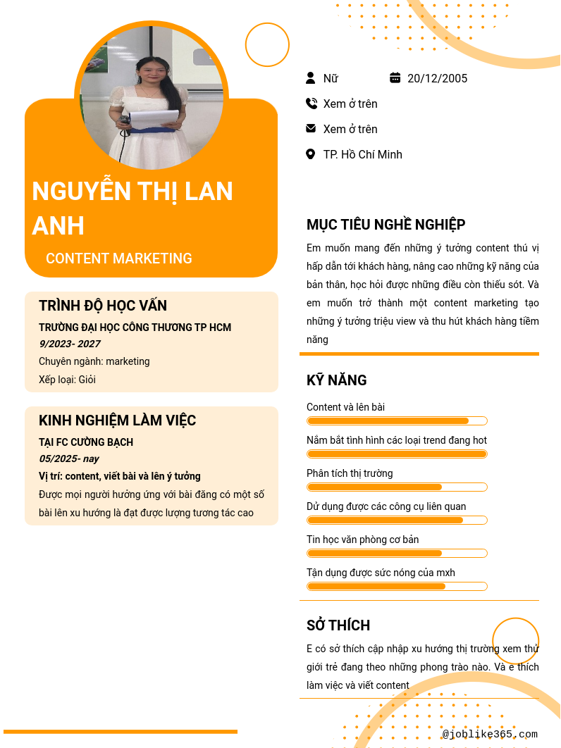 Xem hồ sơ ứng viên Nguyễn Thị Lan Anh cần 2 điểm. Hồ sơ được cập nhật ngày: 13/08/2025