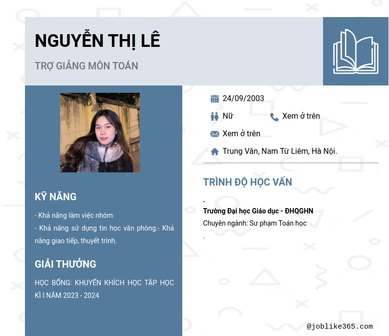 Xem hồ sơ ứng viên Nguyễn Thị Lê cần 2 điểm. Hồ sơ được cập nhật ngày: 15/09/2024