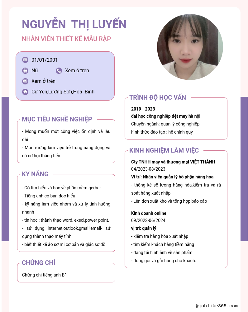Xem hồ sơ ứng viên nguyễn thị luyến cần 2 điểm. Hồ sơ được cập nhật ngày: 05/02/2025