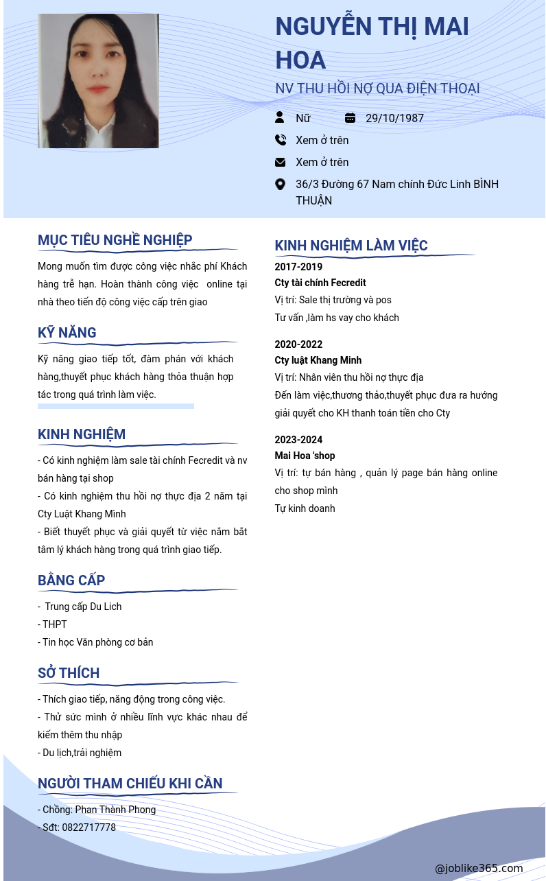 Xem hồ sơ ứng viên NGUYỄN THỊ MAI HOA cần 2 điểm. Hồ sơ được cập nhật ngày: 12/06/2024