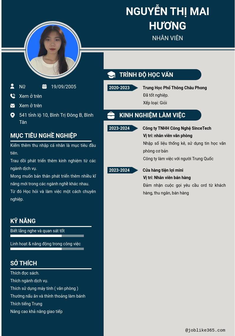 Xem hồ sơ ứng viên NGUYỄN THỊ MAI HƯƠNG cần 2 điểm. Hồ sơ được cập nhật ngày: 14/12/2024
