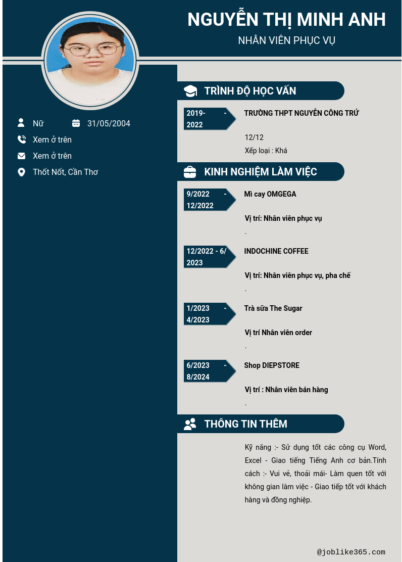 Xem hồ sơ ứng viên Nguyễn Thị Minh Anh cần 2 điểm. Hồ sơ được cập nhật ngày: 25/11/2024