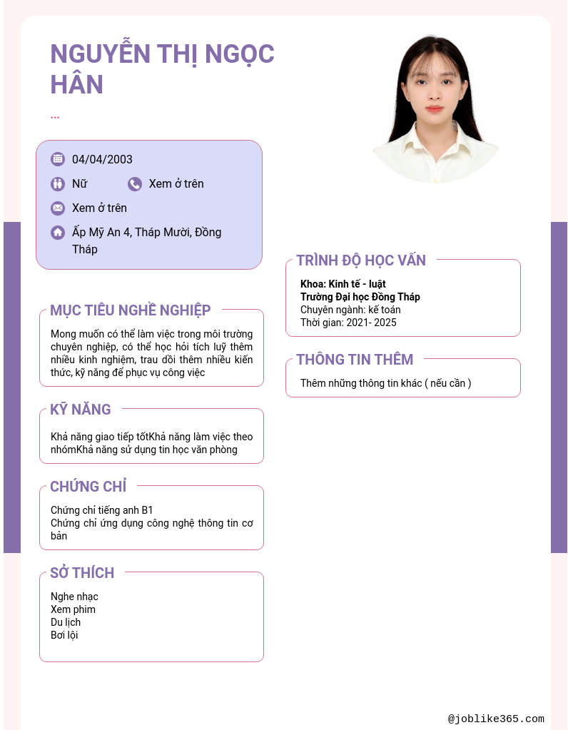 Xem hồ sơ ứng viên Nguyễn Thị Ngọc Hân cần 2 điểm. Hồ sơ được cập nhật ngày: 13/12/2025