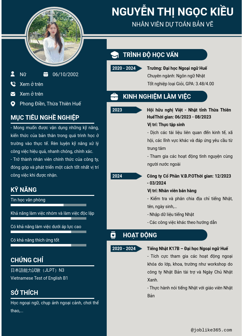 Xem hồ sơ ứng viên Nguyễn Thị Ngọc Kiều cần 2 điểm. Hồ sơ được cập nhật ngày: 09/07/2024