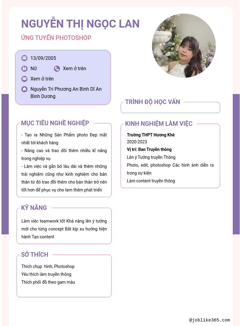 Xem hồ sơ ứng viên Nguyễn Thị Ngọc Lan cần 2 điểm. Hồ sơ được cập nhật ngày: 17/09/2024