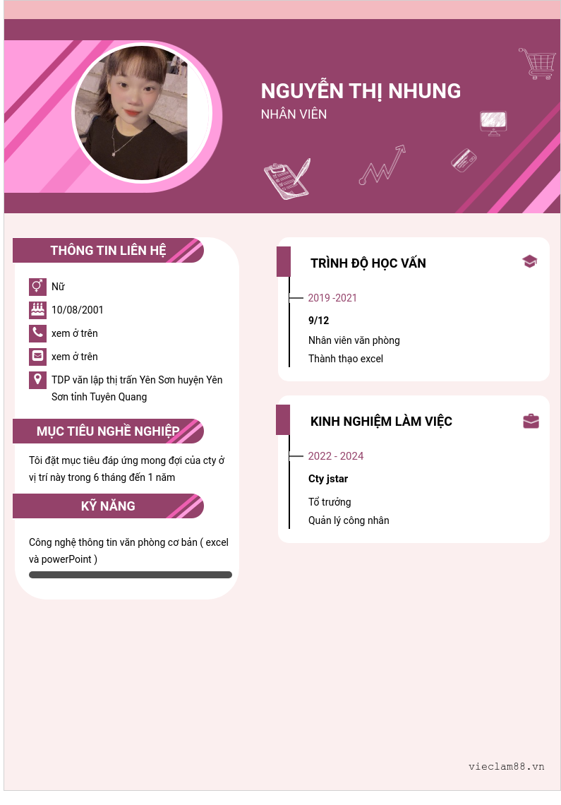 Xem hồ sơ ứng viên Nguyễn Thị Nhung cần 2 điểm. Hồ sơ được cập nhật ngày: 08/09/2024
