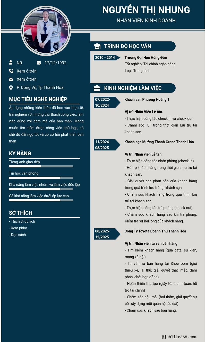 Xem hồ sơ ứng viên Nguyễn Thị nhung cần 2 điểm. Hồ sơ được cập nhật ngày: 22/12/2025