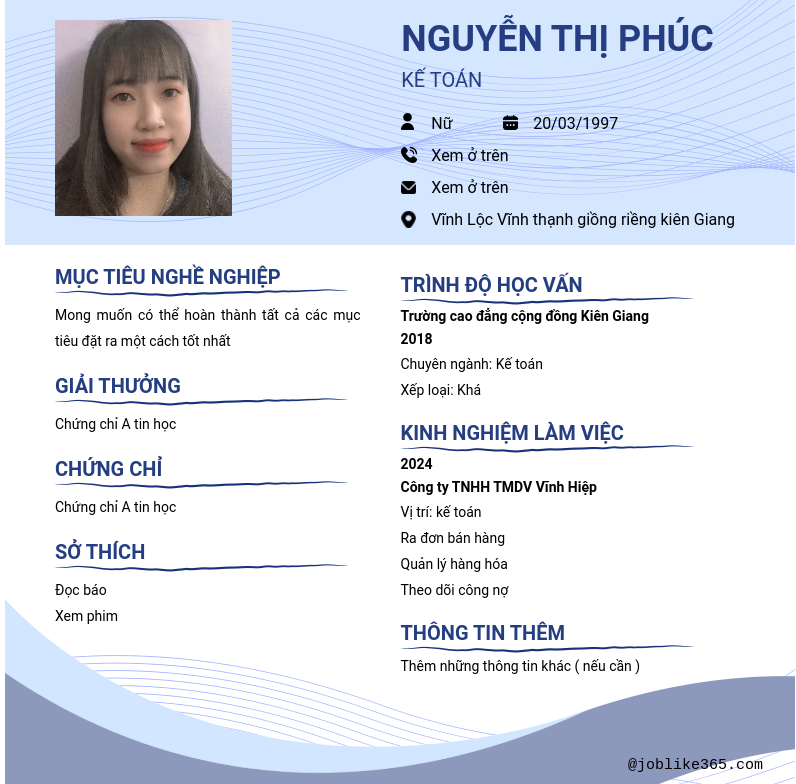 Xem hồ sơ ứng viên NGUYỄN THỊ PHÚC cần 2 điểm. Hồ sơ được cập nhật ngày: 18/09/2024