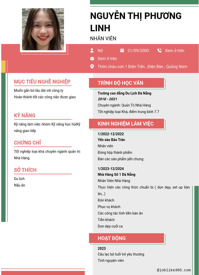 Xem hồ sơ ứng viên Nguyễn Thị Phương Linh cần 2 điểm. Hồ sơ được cập nhật ngày: 14/12/2024