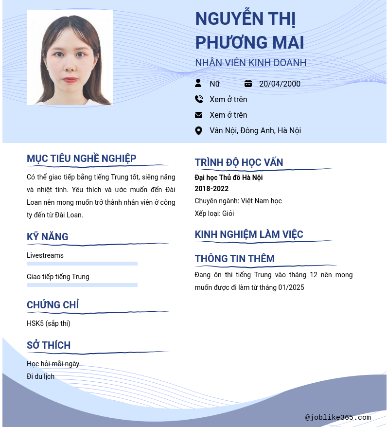 Xem hồ sơ ứng viên Nguyễn Thị Phương Mai cần 2 điểm. Hồ sơ được cập nhật ngày: 22/11/2024