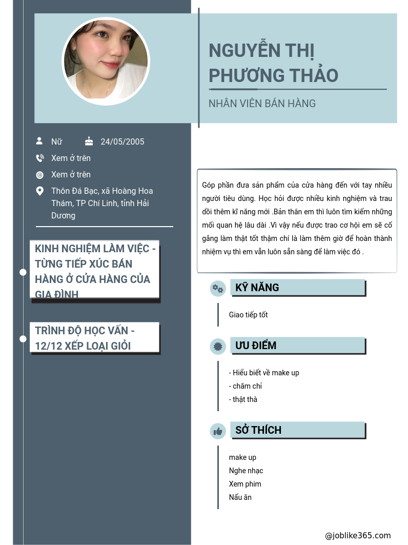 Xem hồ sơ ứng viên NGUYỄN THỊ PHƯƠNG THẢO cần 2 điểm. Hồ sơ được cập nhật ngày: 10/06/2024