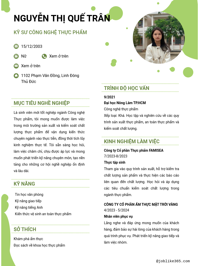 Xem hồ sơ ứng viên Nguyễn thị quế trân cần 2 điểm. Hồ sơ được cập nhật ngày: 18/08/2025