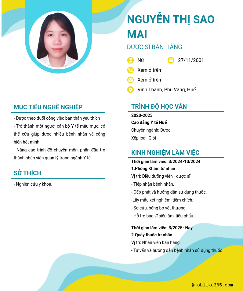 Xem hồ sơ ứng viên Nguyễn Thị Sao Mai cần 2 điểm. Hồ sơ được cập nhật ngày: 05/10/2025