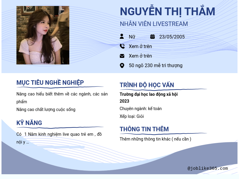 Xem hồ sơ ứng viên Nguyễn thị thắm cần 2 điểm. Hồ sơ được cập nhật ngày: 23/10/2024