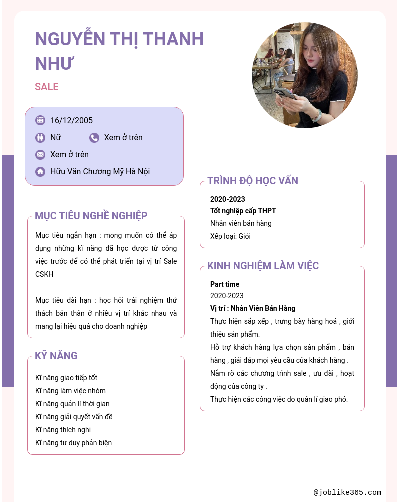Xem hồ sơ ứng viên Nguyễn Thị Thanh Như cần 2 điểm. Hồ sơ được cập nhật ngày: 26/08/2024