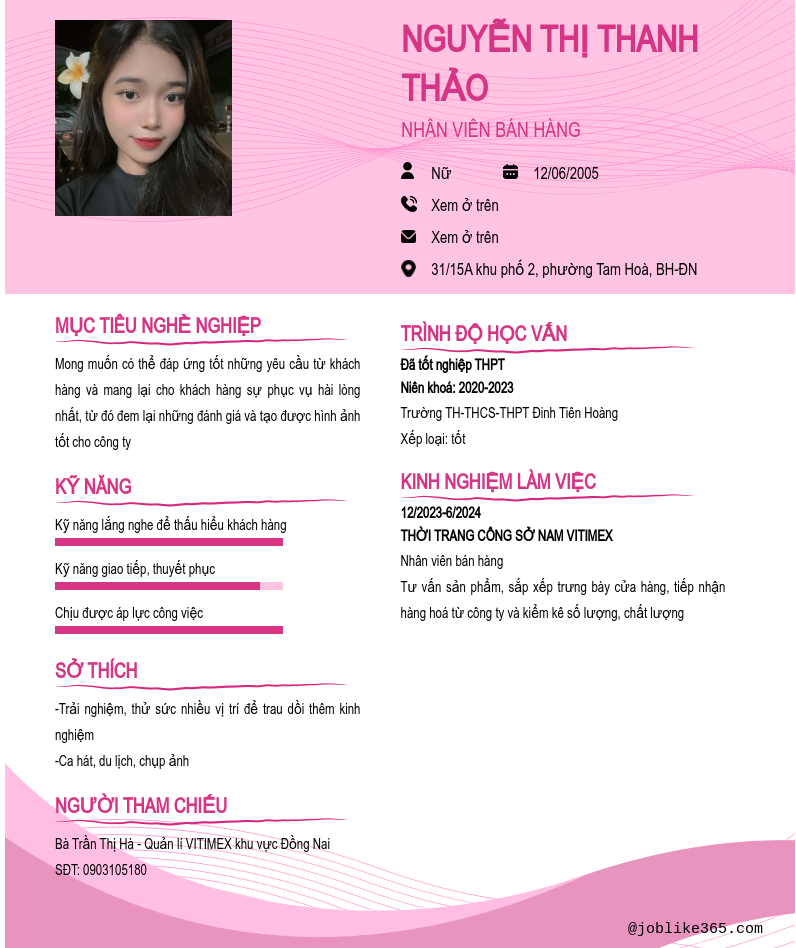 Xem hồ sơ ứng viên NGUYỄN THỊ THANH THẢO cần 2 điểm. Hồ sơ được cập nhật ngày: 07/08/2024