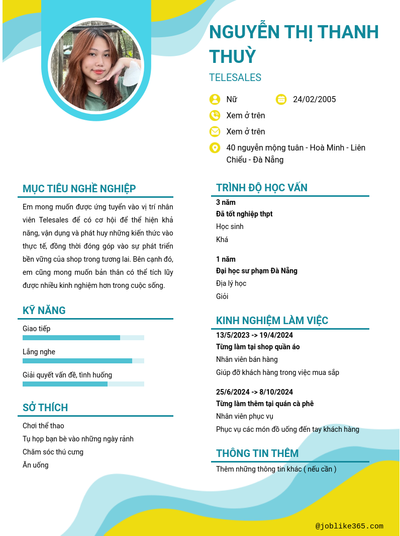 Xem hồ sơ ứng viên NGUYỄN THỊ THANH THUỲ cần 2 điểm. Hồ sơ được cập nhật ngày: 01/01/2025