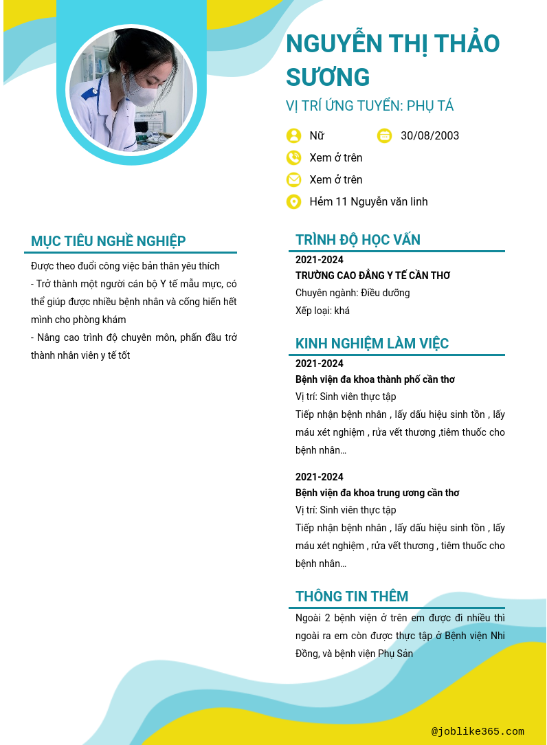 Xem hồ sơ ứng viên NGUYỄN THỊ THẢO SƯƠNG cần 2 điểm. Hồ sơ được cập nhật ngày: 01/08/2024