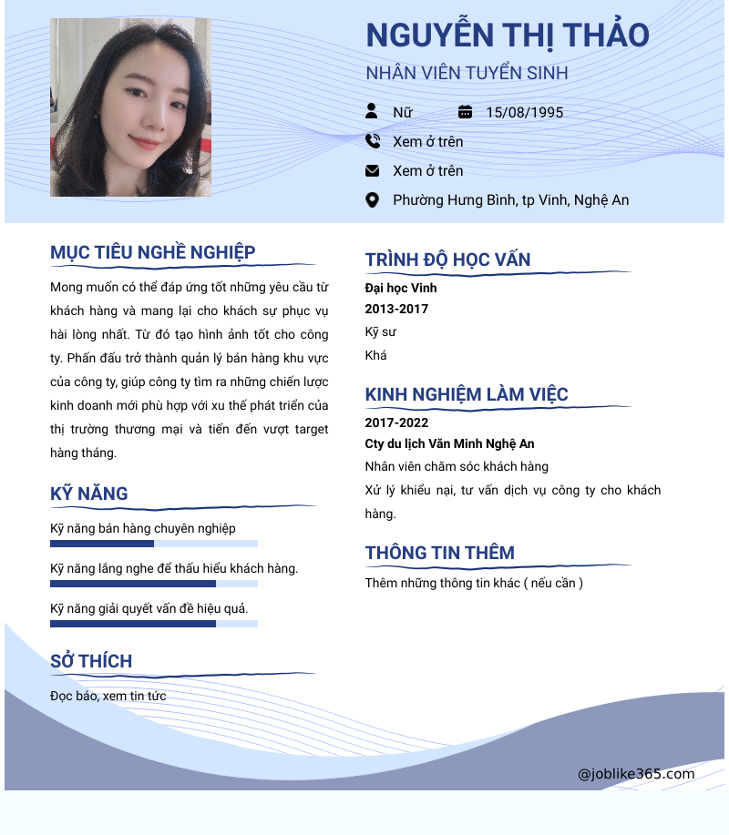 Xem hồ sơ ứng viên NGUYỄN THỊ THẢO cần 2 điểm. Hồ sơ được cập nhật ngày: 16/07/2024