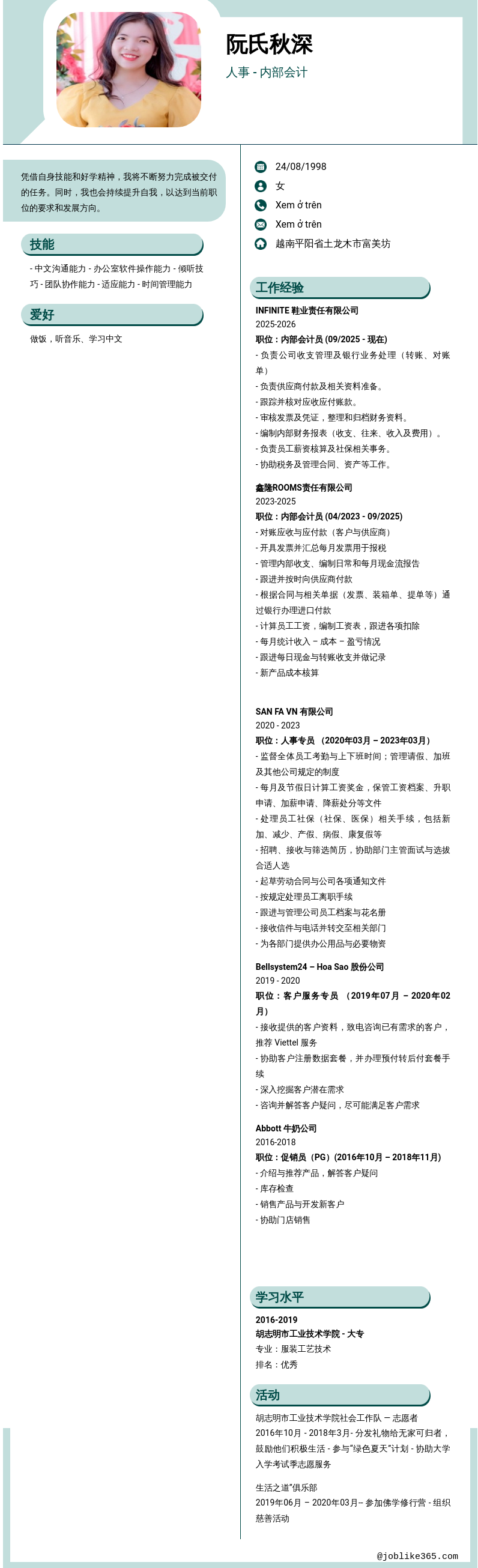 Xem hồ sơ ứng viên 阮氏秋深 cần 2 điểm. Hồ sơ được cập nhật ngày: 19/03/2026