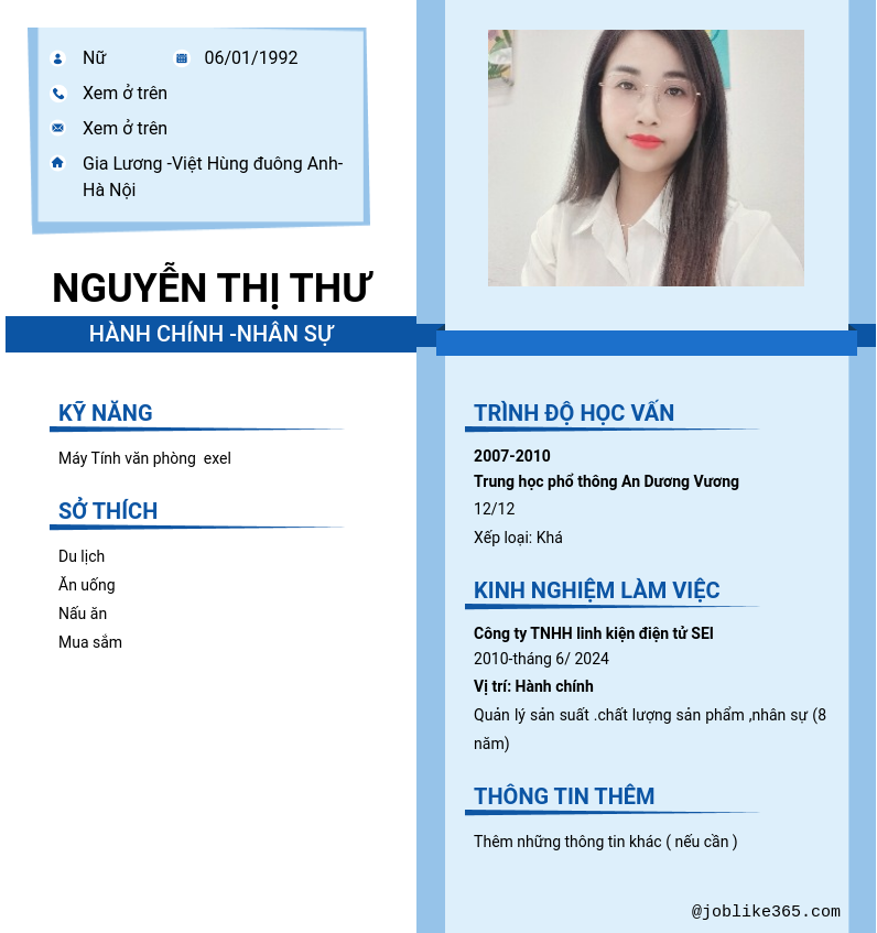 Xem hồ sơ ứng viên Nguyễn Thị Thư cần 2 điểm. Hồ sơ được cập nhật ngày: 22/07/2024