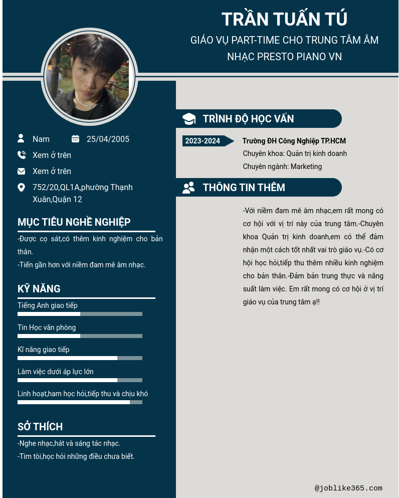 Xem hồ sơ ứng viên Trần Tuấn Tú cần 2 điểm. Hồ sơ được cập nhật ngày: 30/08/2024