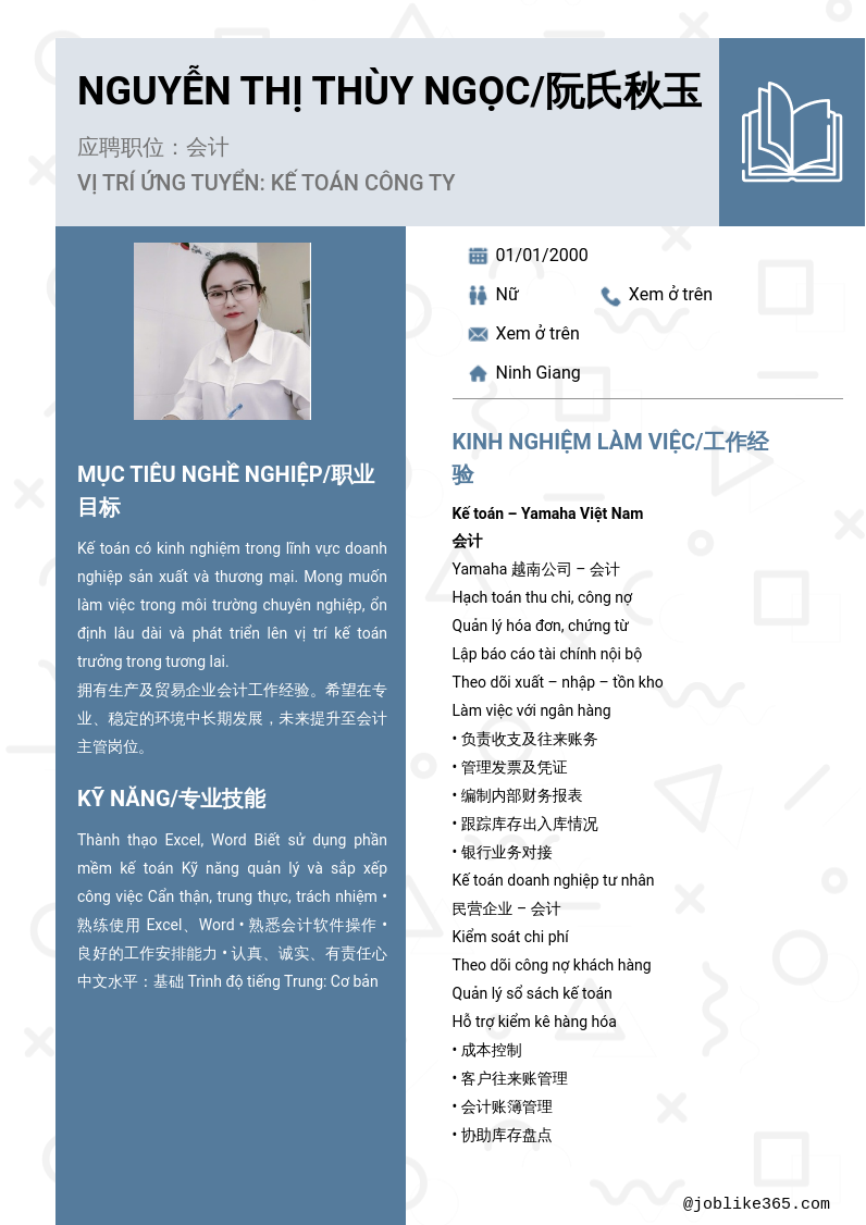 Xem hồ sơ ứng viên nguyễn thị thùy ngọc/阮氏秋玉 cần 2 điểm. Hồ sơ được cập nhật ngày: 03/03/2026