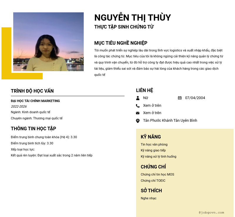 Xem hồ sơ ứng viên Nguyễn thị thùy cần 2 điểm. Hồ sơ được cập nhật ngày: 15/11/2024