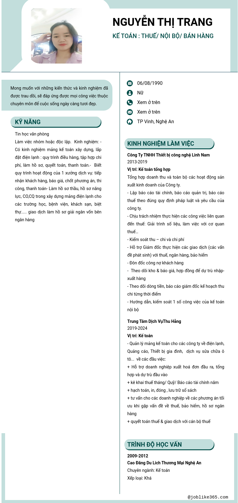 Xem hồ sơ ứng viên Nguyễn Thị Trang cần 2 điểm. Hồ sơ được cập nhật ngày: 01/11/2024