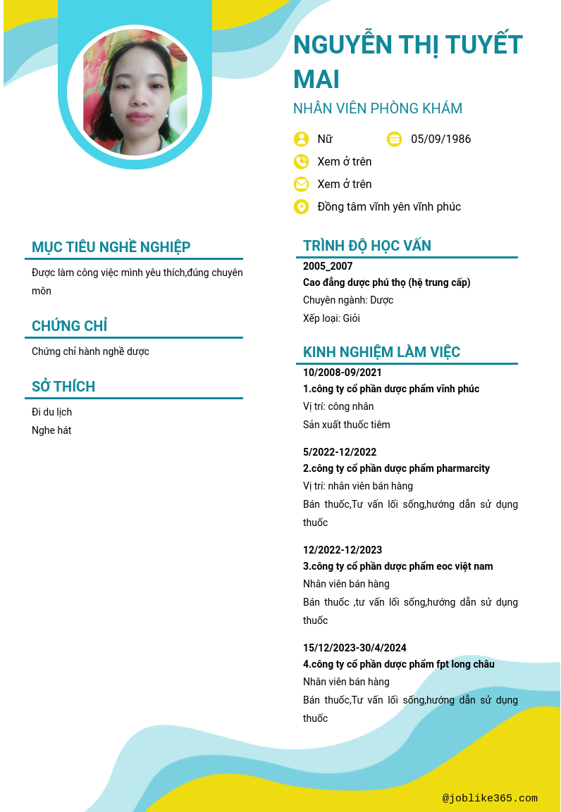 Xem hồ sơ ứng viên Nguyễn Thị Tuyết Mai cần 2 điểm. Hồ sơ được cập nhật ngày: 03/09/2024