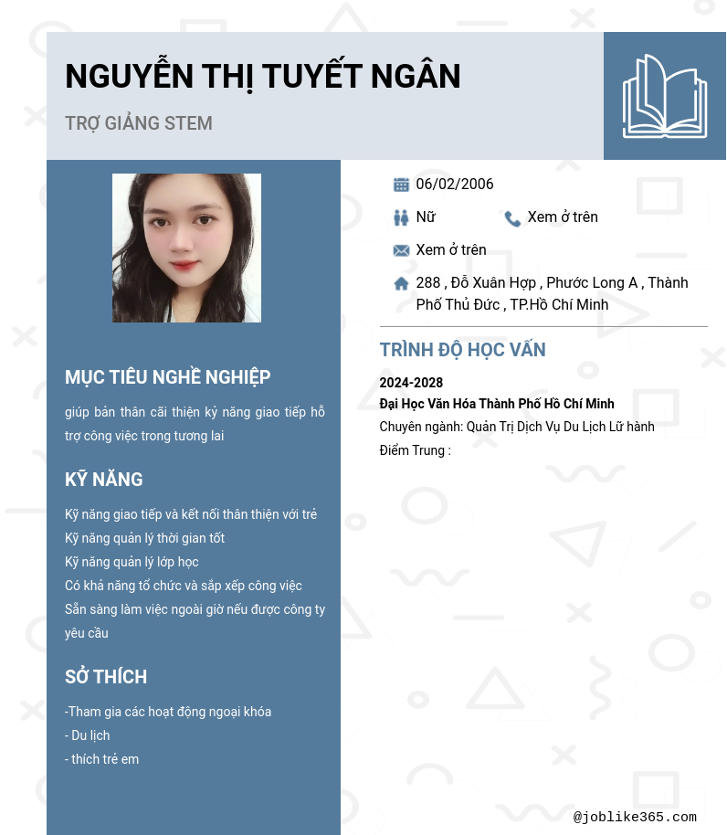 Xem hồ sơ ứng viên nguyễn thị tuyết ngân cần 2 điểm. Hồ sơ được cập nhật ngày: 20/09/2024