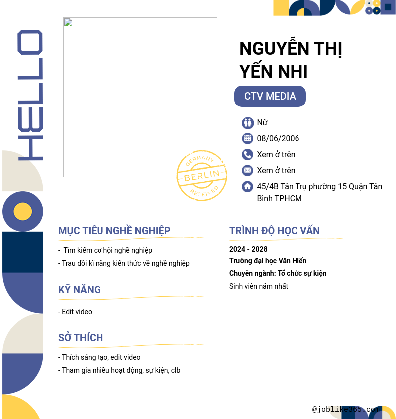 Xem hồ sơ ứng viên Nguyễn Thị Yến Nhi cần 2 điểm. Hồ sơ được cập nhật ngày: 06/10/2024