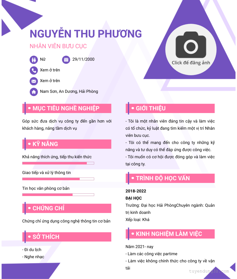 Xem hồ sơ ứng viên nGUYỄN THU PHƯƠNG cần 2 điểm. Hồ sơ được cập nhật ngày: 12/11/2024