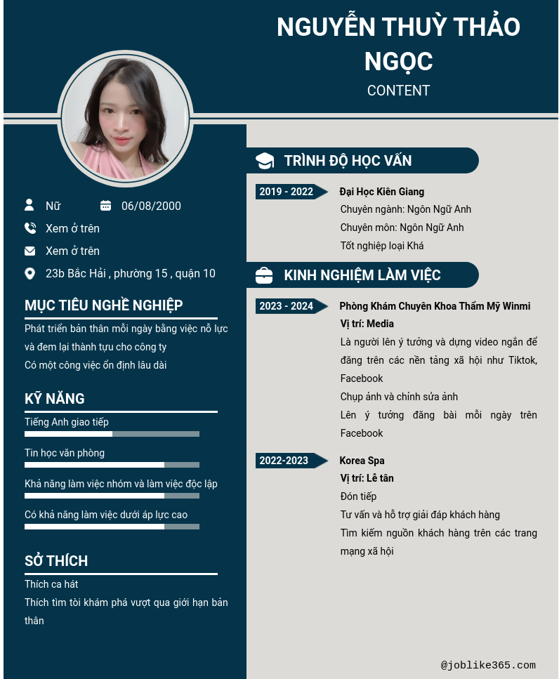 Xem hồ sơ ứng viên Nguyễn Thuỳ Thảo Ngọc cần 2 điểm. Hồ sơ được cập nhật ngày: 10/11/2024