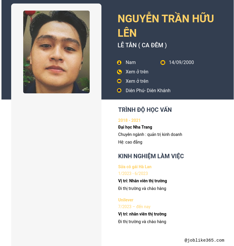 Xem hồ sơ ứng viên Nguyễn Trần Hữu Lên cần 2 điểm. Hồ sơ được cập nhật ngày: 30/11/2024