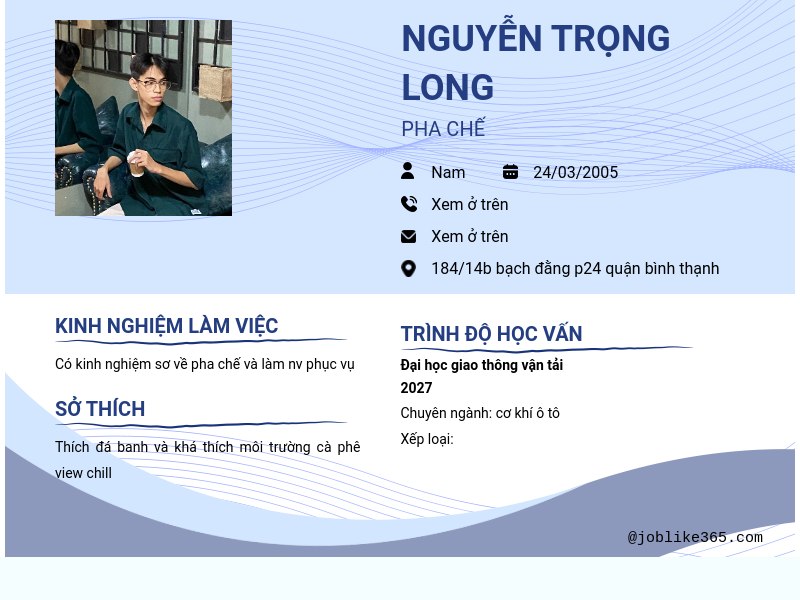 Xem hồ sơ ứng viên Nguyễn trọng long cần 2 điểm. Hồ sơ được cập nhật ngày: 27/08/2024