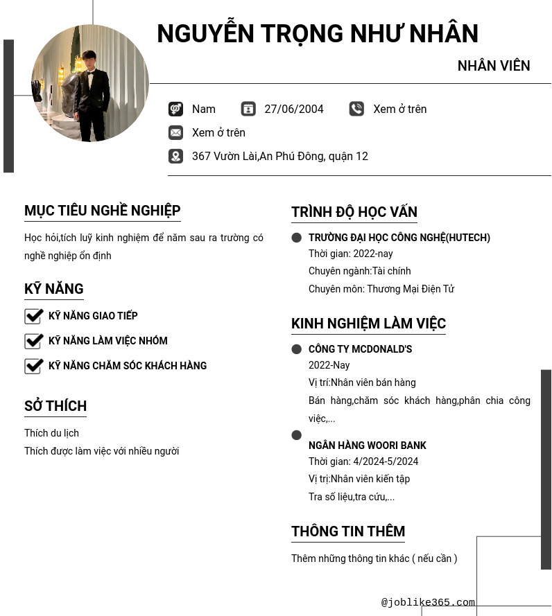 Xem hồ sơ ứng viên Nguyễn Trọng Như Nhân cần 2 điểm. Hồ sơ được cập nhật ngày: 29/09/2024