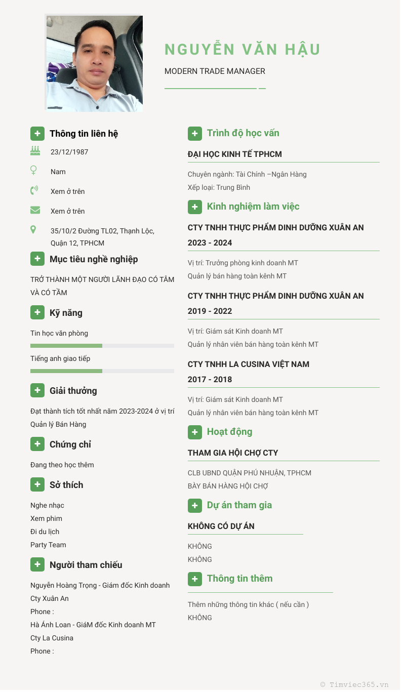 Xem hồ sơ ứng viên Nguyễn Văn Hậu cần 2 điểm. Hồ sơ được cập nhật ngày: 09/11/2024