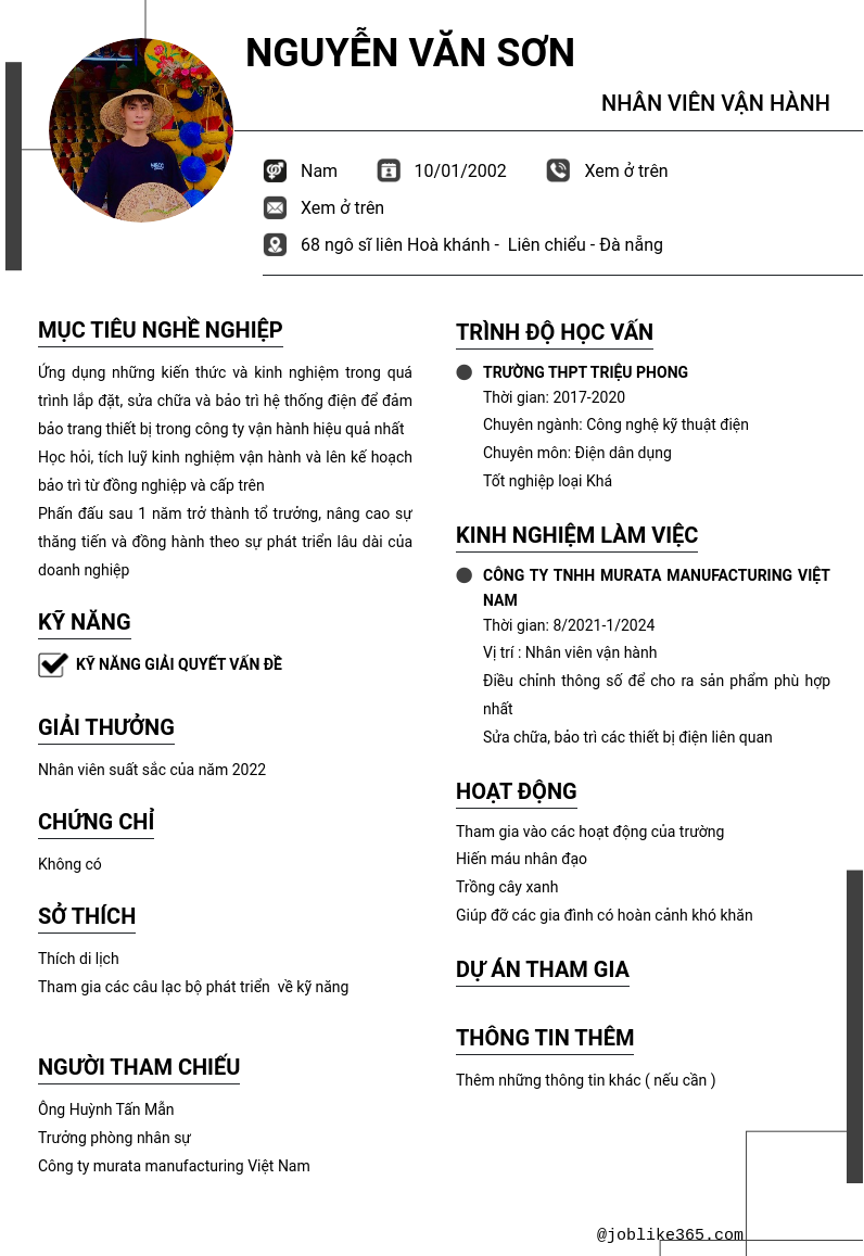 Xem hồ sơ ứng viên Nguyễn Văn Sơn cần 2 điểm. Hồ sơ được cập nhật ngày: 15/08/2024
