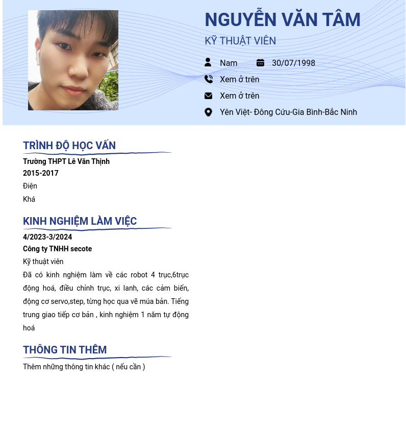 Xem hồ sơ ứng viên NGUYỄN VĂN TÂM cần 2 điểm. Hồ sơ được cập nhật ngày: 27/05/2024
