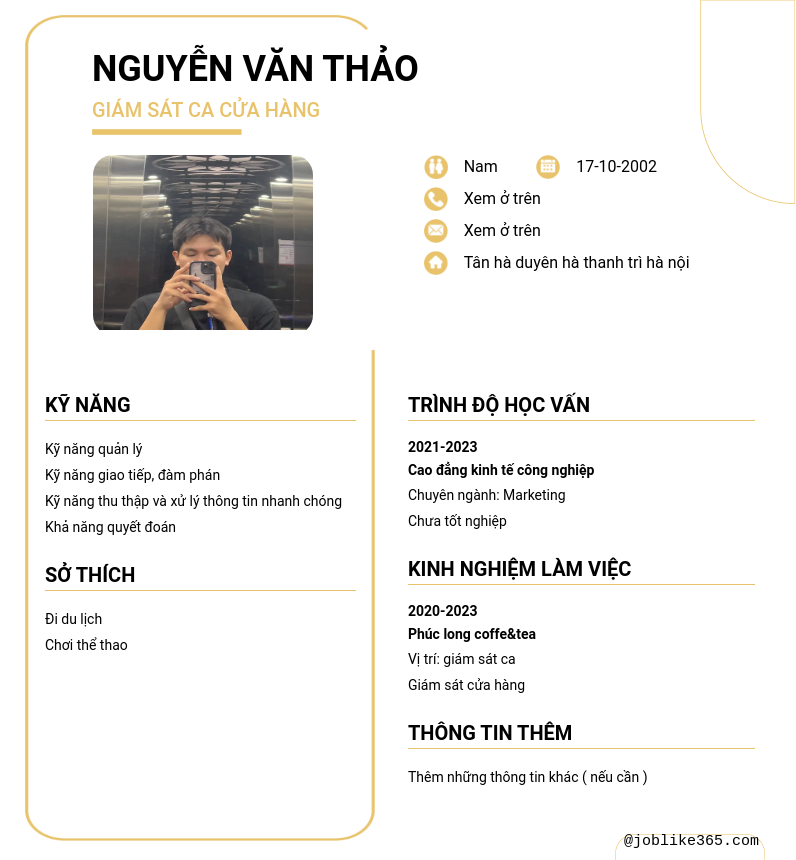 Xem hồ sơ ứng viên Nguyễn văn thảo cần 2 điểm. Hồ sơ được cập nhật ngày: 27/07/2024
