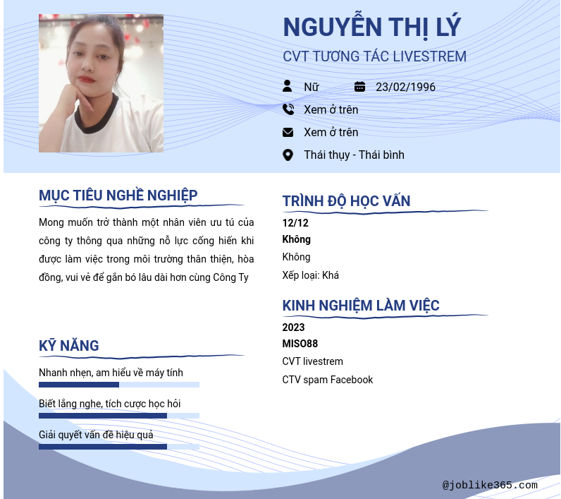Xem hồ sơ ứng viên Nguyễn Thị Lý cần 2 điểm. Hồ sơ được cập nhật ngày: 25/07/2024