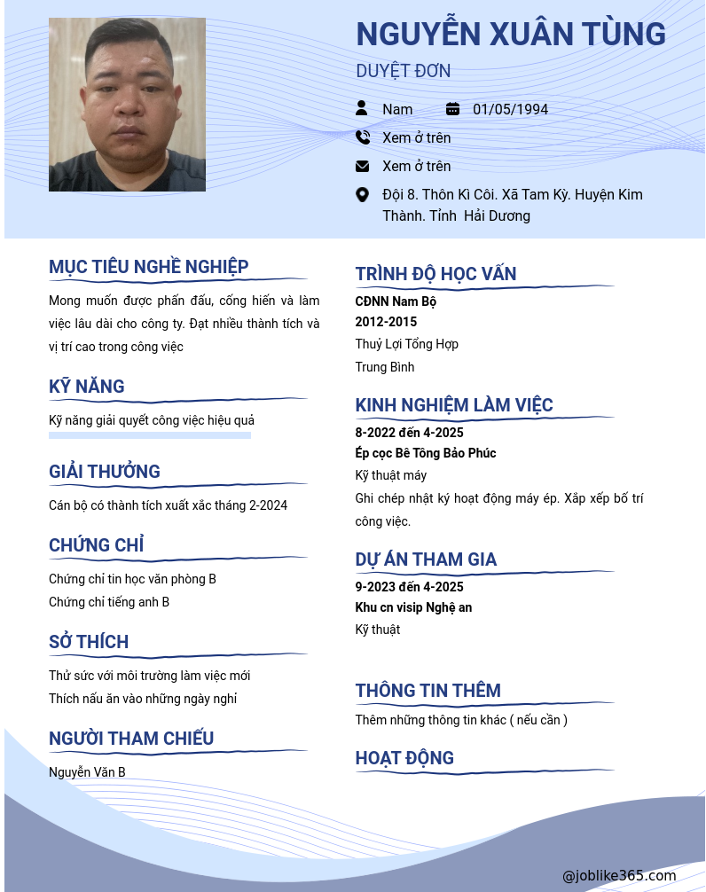 Xem hồ sơ ứng viên NGUYỄN XUÂN TÙNG cần 2 điểm. Hồ sơ được cập nhật ngày: 01/06/2024