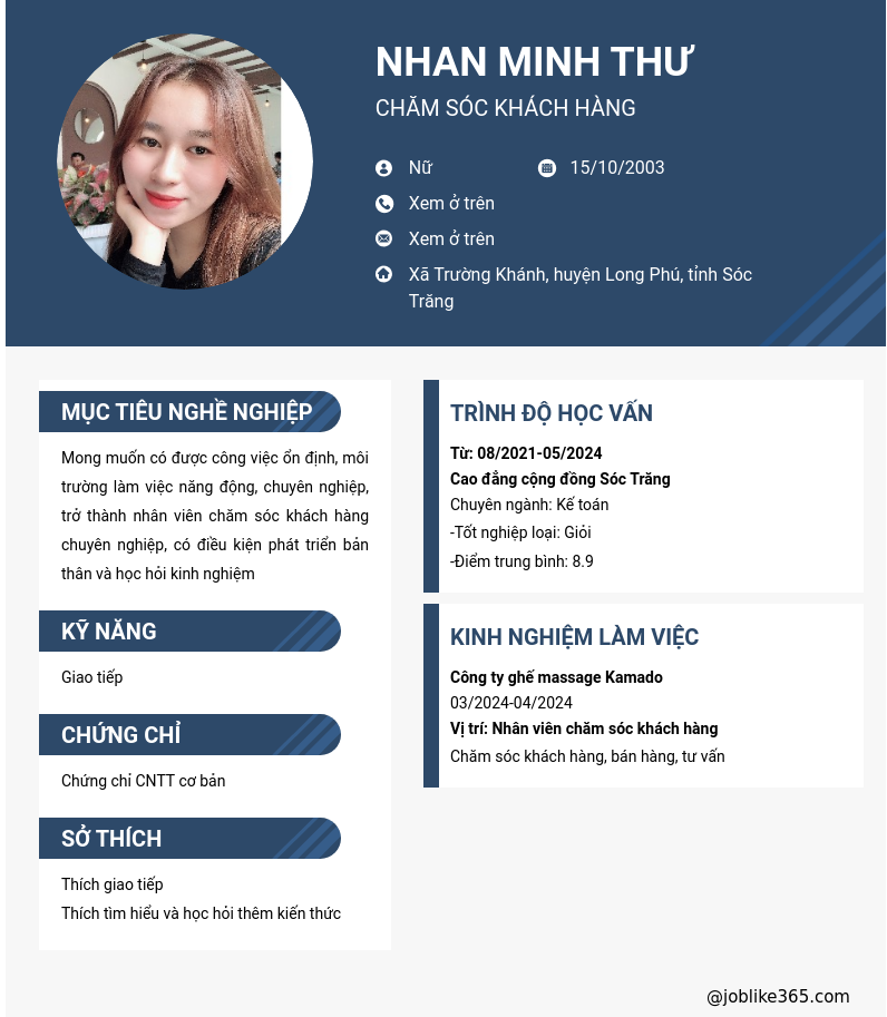 Xem hồ sơ ứng viên Nhan Minh Thư cần 2 điểm. Hồ sơ được cập nhật ngày: 03/03/2025