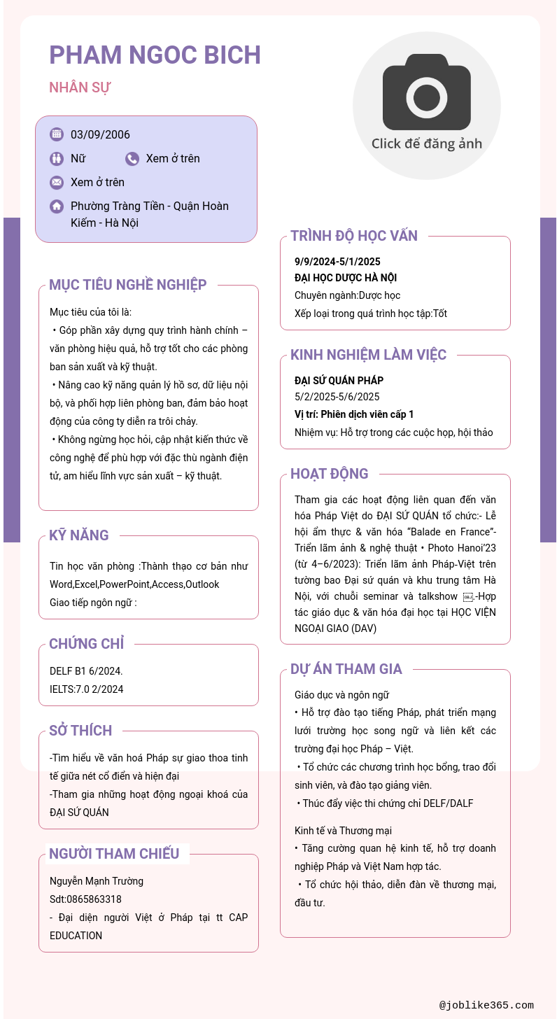 Xem hồ sơ ứng viên PHAM NGOC BICH cần 2 điểm. Hồ sơ được cập nhật ngày: 19/06/2025