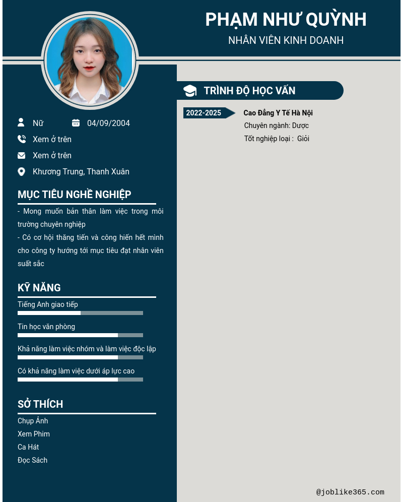 Xem hồ sơ ứng viên phạm như quỳnh cần 2 điểm. Hồ sơ được cập nhật ngày: 21/08/2024